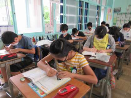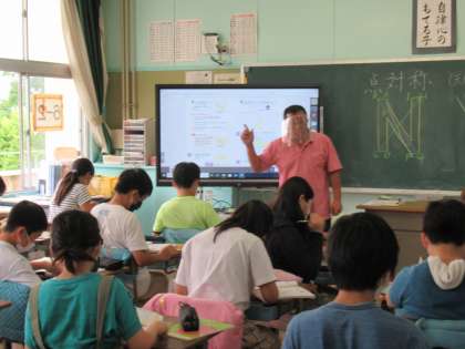 6年生の算数です。図形の学習がどんどん深まっており、今日は点対称な図形について学んでいました。「対称の中心」について理解し、自力で点対称な図形をかくことができるようにしていきます。
