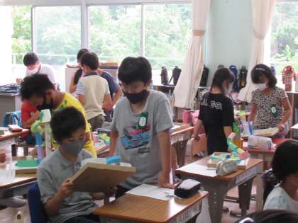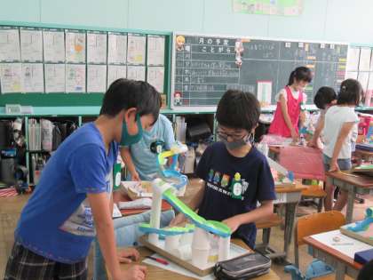 4年生の図工です。これまで作ってきた「コロコロガーレ」。ビー玉が転がる仕組みを生かした楽しい活動です。作品ができあがりましたので、友達の作品で、実際にビー玉を転がして楽しんでいました。