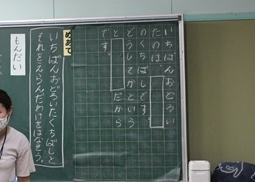 1年生の国語「くちばし」です。「いちばんおどろいたくちばしとそれをえらんだわけをはなそう」という課題でした。先生が黒板に書いた話し方の「話型」を見本にして,伝えたいことをしっかり伝えることを学んでいました。