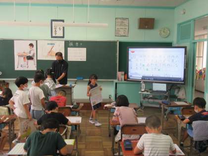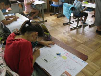 2年生の書写です。今日は横書きについて学んでいました。たて書きとの違いを教えてもらい、実際に書いて確認していました。小さい「ょ」とか句読点「。」「、」などは、ますのどの部屋に書くといいか、しっかり覚えてくださいね。