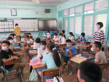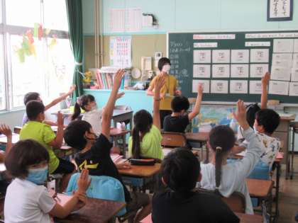 5年生の外国語です。「What is your birthday?」のフレーズを使って会話をしていました。答えるためには、月の呼び方を英語で言えないといけません。二人で順番にJanuary、 February・・・と掛け合いのように言っていき、完璧に言えたらみんなで拍手していました。耳、口、目、頭を使ってみんで楽しく覚えていました。