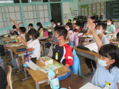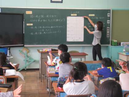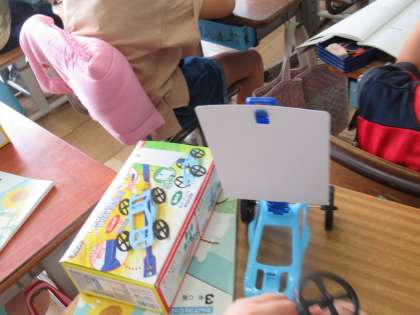 3年生の理科です。これまで、風やゴムで動く仕組みの実験用の車で、風を当ててどのように動くか実験をしてきました。今日は、弱い風と強い風でどのような違いがあったか振り返り、まとめをしていました。
