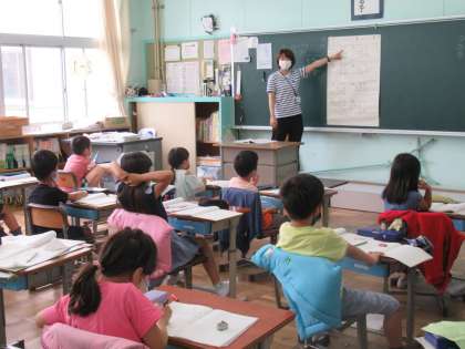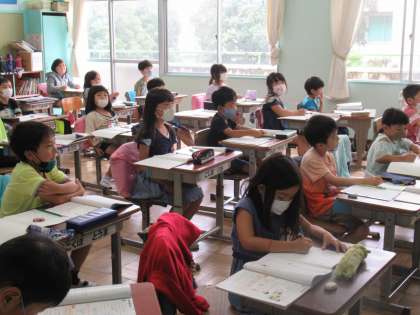 2年生の算数です。たし算の筆算の授業が進んでいます。48+32、65+25といった計算を学んでいました。練習問題を解いて、くり上がりのある計算にどんどん慣れていきます。