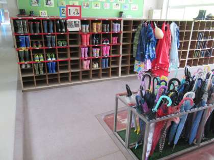 きれいに並べられている長ぐつ、傘、かっぱ。この先2〜3週間程度、活躍し続ける毎日になりそうです。