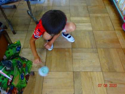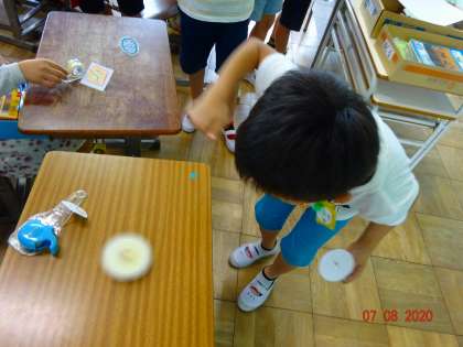 国語科で「こまを楽しむ」の学習をしました。こまの種類や楽しみ方を知った後、皆で色がわりごまを作りました。色がわりごまの表面に色を塗って回すと元の色と違うことに気付きました。文章で書いてあることを体験から知ることができました。