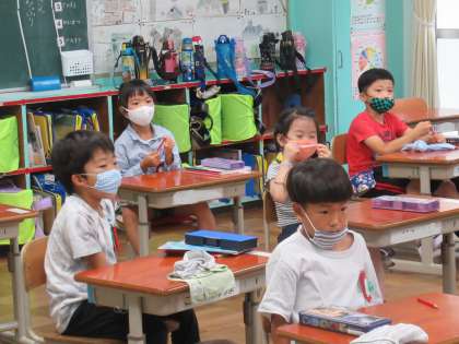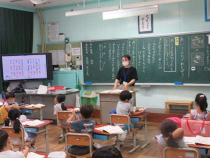 1年生の国語です。「あおうえおのうた」を楽しく読んでいました。「あやとり いすとり あいうえお かきのみ くわのみ かきくけこ ・・・」。先生と子どもたちが掛け合いのようにして、楽しく読んでいました。習ってきたひらがなに慣れ親しむ活動です。