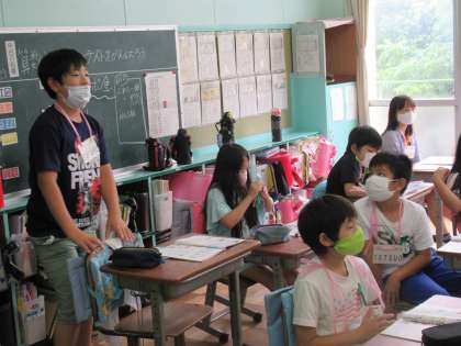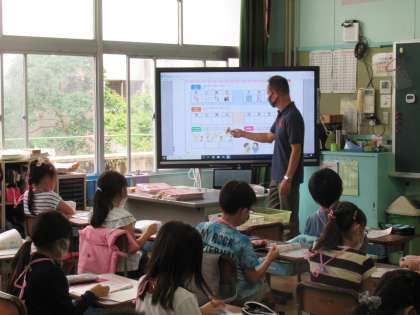 4年生の外国語活動です。さし絵を見ながら、何曜日にどんな予定が入っているかを英語で表現していました。そして、自分の予定を思い浮かべて、英語で表現していました。曜日を英語でどう言うか、自然に身についていく様子でした。