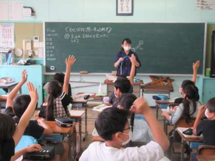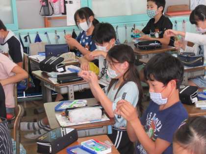 5年生の家庭科です。裁縫の学習が進んでいます。玉止め、玉結びについて練習し、今日は一人一人テストもするそうです。手縫いをする上で、基本的に必要な技術ですので、みんな一生懸命です。