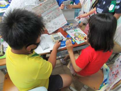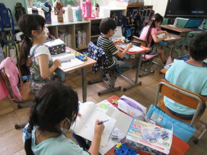 4年生の理科です。実験キットと検流計を使って、乾電池のつなぎ方と電流の流れ方の関係について調べていました。実験結果は、理科ノートにまとめていました。