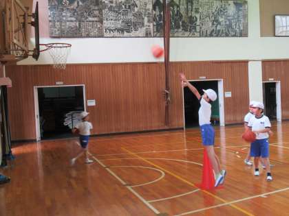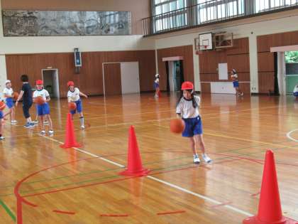 4年生の体育です。換気をし、密を防ぎながら、単元を入れ替え、できることを進めています。少し早いのですが、バスケットボールを使って、ドリブルやシュートなど個人の技能を高める活動をしていました。