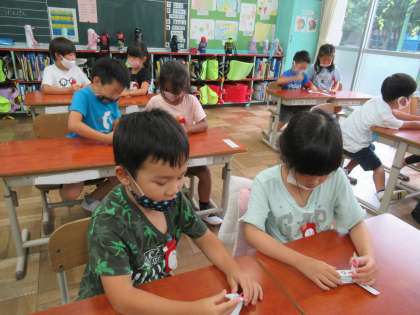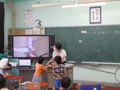 1年生の算数です。たし算の学習が進んでいます。今日は、各自のたし算カードを使って、となりの子とカードを見せ合い、合計の数が大きい方が勝ち、という活動をしていました。まずはやり方を電子黒板で確認し、活動開始です。こうやって楽しくたし算になじみ、定着させていきます。