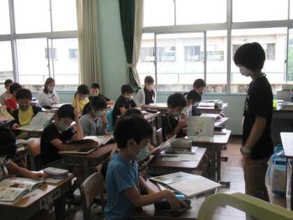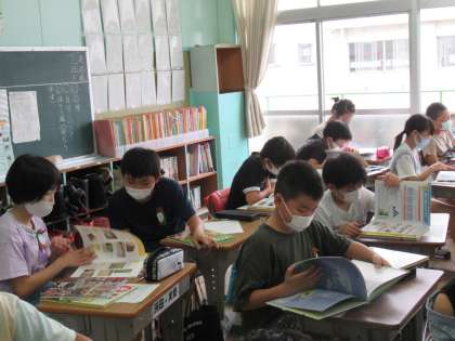5年生の総合的な学習の時間です。米についてテーマを考え、課題追究をしていきます。今日は、学校や市立図書館の本をもとに、自分が追究していきたいテーマについて考えていました。