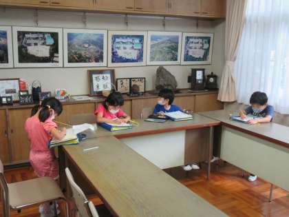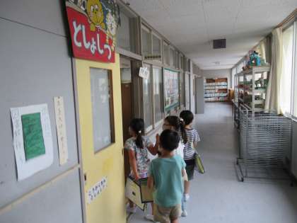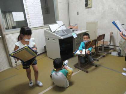 1年生の生活科です。学級全体での校内めぐりはしていましたが、今日はグループでの学校探検をしました。特別教室を中心にグループで探検し、その部屋にあったものなどをメモしていました。校長室にも来てくれました。