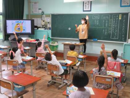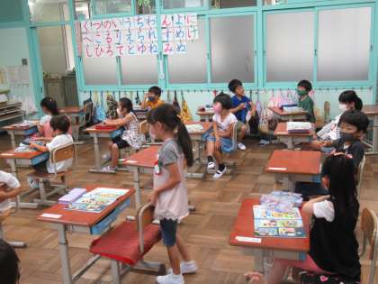 1年生の道徳です。「きもちのよいせいかつ」について、教科書の絵を見て話し合っていました。朝起きて着替える時間、もし着替えなかったら?・・・。朝食を食べる時間、もし食べなかったら?・・・と、具体的に思い浮かべて話し合っていました。