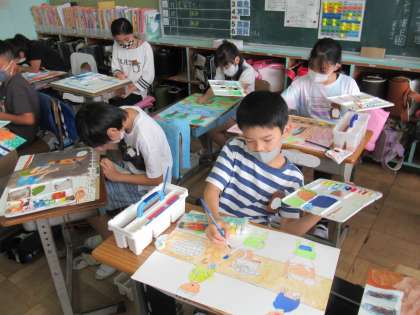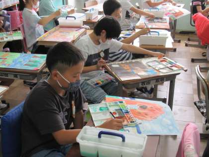5年生の図工です。「心に残ったあの時あの場所」という活動です。そのタイトル通り、心に残っている場面を思い起こし、絵にしています。そのときの気持ち、感動が伝わるようにダイナミックに描いています。