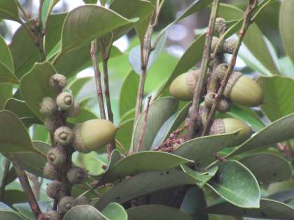 いつの間にやらドングリが着々とできてきています。ドングリと言っても、いろいろな種類の木があるのですが、これは何でしょうか。ドングリの見分け方は、形だけでなく、葉っぱのギザギザのあるなし、そしていわゆる帽子の部分の模様などで判断できるそうですが、私は詳しくないのでよくわかりません。ちょっと調べた感じでは、葉っぱの形から、マテバシイかも、というところです。はっきりわかったらまたお伝えします。