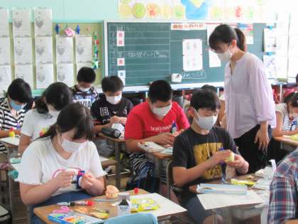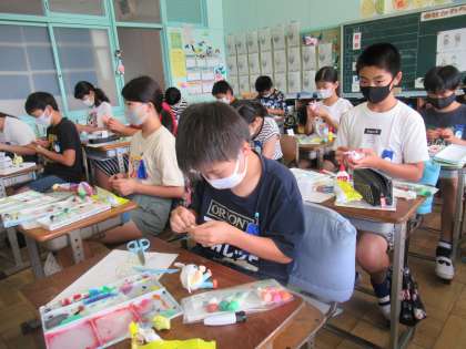 6年生の図工です。「光の形」という活動をしています。中にLEDライトが入っている卵形の型に、紙粘土でさまざまな飾りをつけて、オリジナルのオブジェを作っています。作品作りに集中しており、話し声が全くない中、時間が流れていました。友達との関わり合いも楽しいけど、ひたすら作品作りに没頭するのはひと味違う崇高な楽しさですね。