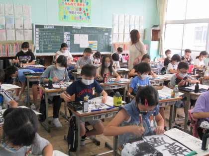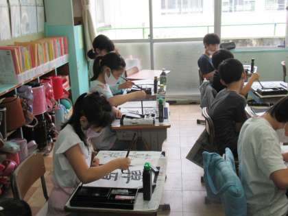 5年生の書写です。毛筆で「草原」という字の学習に入っています。かんむり、たれなどのへんと、つくりの部分の組み立て方を意識して、練習していました。美文字目指してみんな、真剣そのものです。