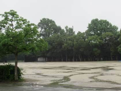 運動場は雨で川ができています。梅雨らしい光景です。