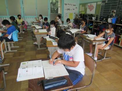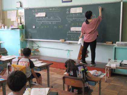 2年生の算数です。「図をつかって考えよう」の学習が進んでいます。わからない数を□とし、図に表わして考えます。今日は、「シールをもっていました。お母さんからシールを8まいもらったので24まいになりました。はじめは何まいありましたか。」といった、「はじめの数」を求める学習でした。