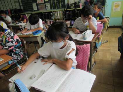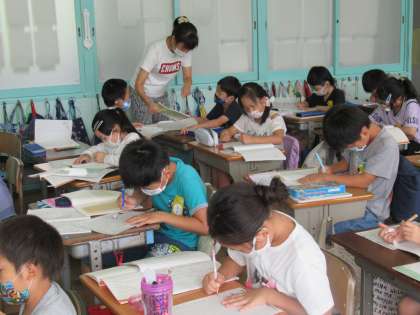 3年生の国語です。「気もちをこめて『来てください』」の学習が進んでいます。今日は、教科書で学んだことを生かし、「知多の友」を使って実際に手紙を書き方を学んでいました。
