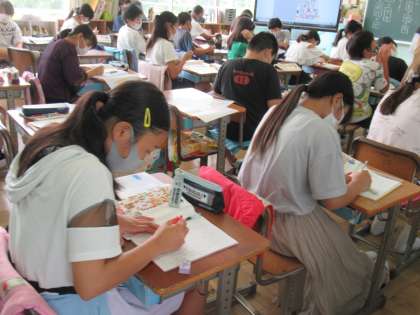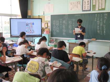 6年生の国語です。楽しげな遊園地の絵が描かれた「漢字の広場」のページを使って、漢字の学習をしていました。絵の中に出てくる「祖父」「可能」「断る」などの漢字を使って、文をたくさん作っていました。
