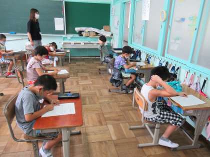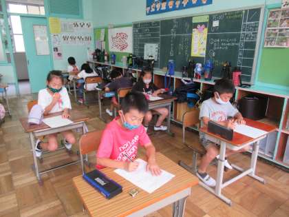 2年生の音楽です。今日は「天国と地獄」「山のま王のきゅうでんにて」を聴いて、気付いたことや、おもしろいと思ったことを、書いていました。机をテストのときのような隊形にして、音楽に集中していました。2年生になると、言葉で表現する力もずいぶんとついてきます。