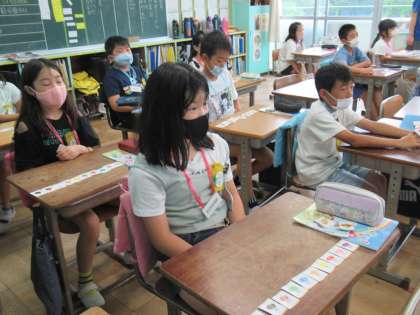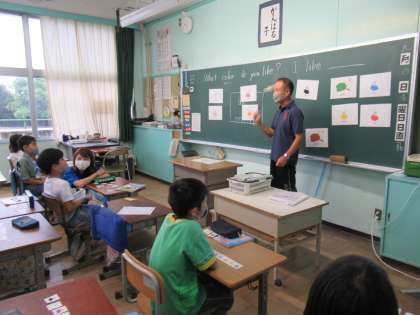 3年生の外国語活動です。好きな色を聞かれて、それに答える活動をしていました。歌に合わせ、楽しみながらたくさんの色の英語表現を身につけていました。