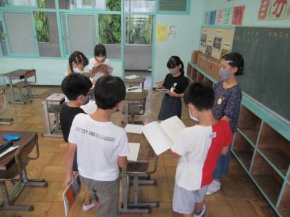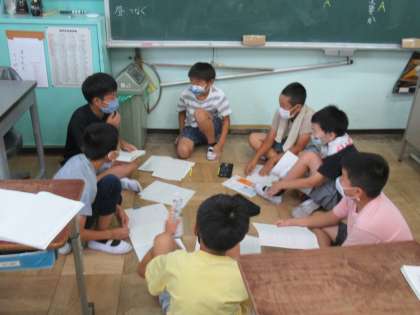 5年生の国語です。「どちらを選びますか」の学習で、討論会に向けての準備の時間です。立場の同じ者同士でグループを作り、討論会に向けて論点を整理し、主張の内容について意見を出し合っていました。
