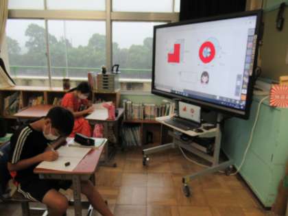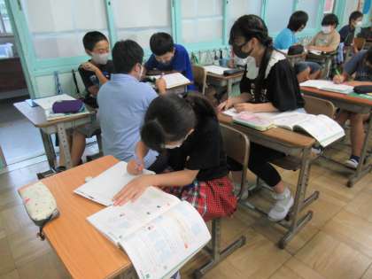 6年生の算数です。立体の体積を求める学習が進んでいます。「底面積×高さ」を使って、さまざまな問題を考えていました。底面積を求めること自体の難易度が高くなっていますので、苦労しますね。ときおり、周りの友達と話し合いながら、理解を深めていました。苦労するからこそ、自力で答えを出せるようになったときの喜びも大きいです。