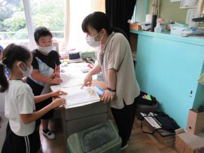 2年生の国語です。「ことばあそびをしよう」という学習をしています。たとえば、「あいうえお」を使って、ありが、いけに、ういている・・・といった文を作っています。自信作を仕上げて先生に見てもらっていました。
