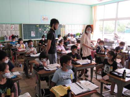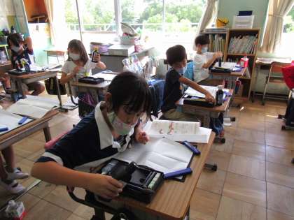 3年生の書写です。毛筆の学習が進んでいます。3年生ですので、道具の準備の仕方からていねいに進めています。道具、姿勢、筆の持ち方など順番に確認し、今日は横画の練習をしていました。