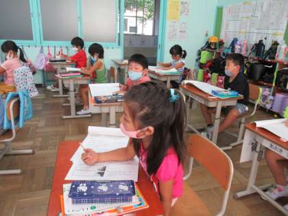 1年生の国語で「やくそく」というお話を読み、話のあらすじを確認していました。3びきのあおむしたちと大きな木のあたたかなやりとりのあるお話です。お話を楽しみながら、正しく音読できるようになってくださいね。