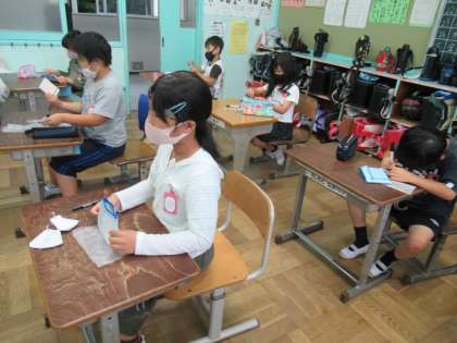 2年生の算数です。九九の学習に入りますが、今日は九九カードが配られ、自分で名前を書いていました。九九の学習は2年生の算数でも、特に大事な学習になります。最終的にすべての子が完全に覚えられるようにしていきます。