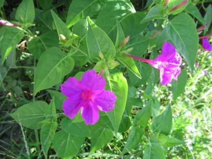 オシロイバナは、黒い果実を割ると、白い粉質のものがあり、それがおしろいの粉のようなので、この名がつけられているそうです。日本には江戸時代に入り、各地で野生化しているものも多く見られるとのこと。品種名のないものがほとんどで、花色は赤、オレンジ、黄色、ピンク、白があるそうです。旭北小では、写真のピンクのみ咲いています。