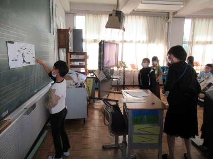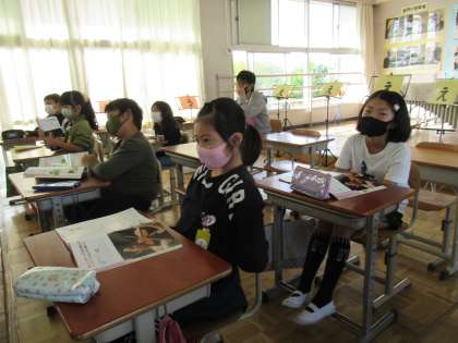 3年生の音楽です。ドボルザーク作曲「ユモレスク」。バイオリンの音色もメロディーも大変美しく、小学校の授業でこの曲を聴いてクラシック音楽を好きになる子もいます。旋律の変化を聴き取る活動では、先生が演奏してくれる「ユモレスク」を聞き、黒板の旋律の図に合わせて手を動かして楽しんでいました。順番に全員がやっていき、待つ時間も友達の活動の様子を見て、楽しんでいました。