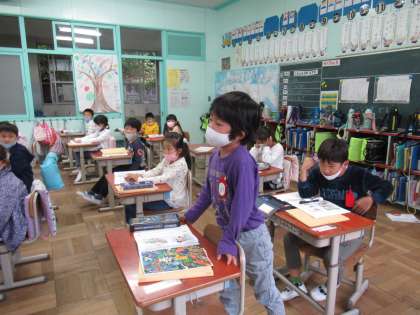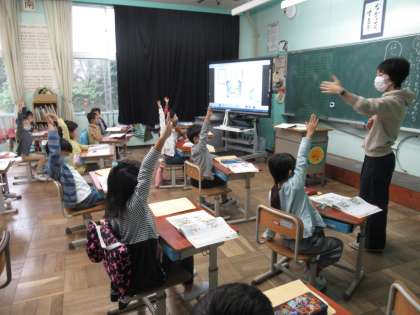 1年生の道徳です。「なんて いったら よいのかな」の学習をしていました。教科書にあるさまざまな生活の場面の挿し絵を見て、この場面で相手にどんなことを言ったらいいのか考える授業でした。デジタル教科書の絵をみんなでみて、自分ならどう言うかあれこれ考えていました。