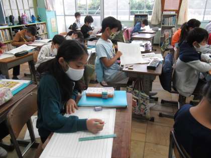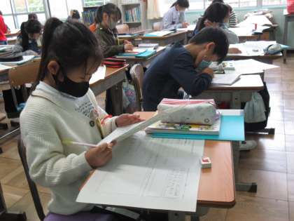 3年生の総合的な学習「ライフ」の時間です。知多市について各自のテーマで追究しています。公園のこと、梅のこと、図書館のこと・・・一人一人のテーマは違いますが、調べながらどんどん掘り下げていく姿勢はみんな同じ。各自コンピューターなどで調べた資料を持ち寄り、まとめていました。