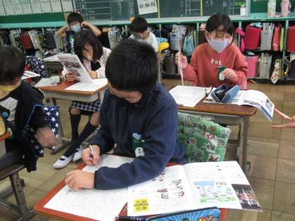 4年生の社会科です。自然災害から人々を守る活動について、教科書(補助資料)などの資料を参考にして調べ、新聞にまとめていました。今までの経験があるので、新聞の書き方もうまくなっていますね。