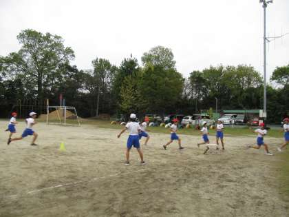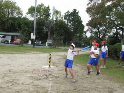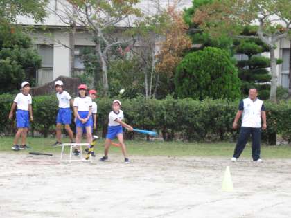 6年生の体育です。ベースボール型ゲームとしてのティーボールをしていました。チームで協力して楽しく活動できるように、独自のルールが加えられていて、大盛り上がり。一人がバッティングした後、そのチーム全員でコーンまで走って全員がベースに戻ったら得点。しかも、コーンの位置はいろいろあり、選択可能。技能だけでなく、考える力も求められるチーム競技になっていました。