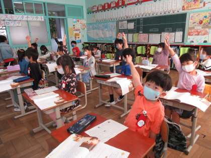1年生の道徳です。今日のお話は「ダメ!」。くまくんは、大すきなプリンを、自分のぶんだけでなく、りすくんのぶんも食べてしまい・・・。体も大きく、声も大きいくまくんに「ダメ!」と言えなかった主人公のくやしさに共感しながら、正しい行いについて考えていました。