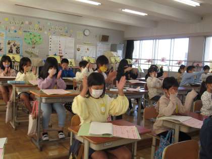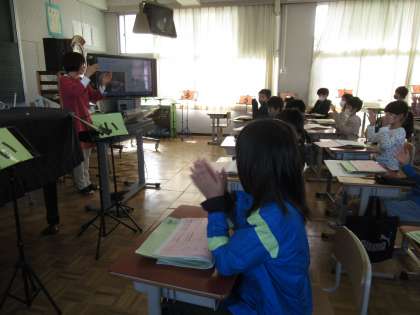 3年生の音楽です。楽しそうな手拍子の音に誘われて音楽室に入ってみると、全音ぷ、2分音ぷ、4分音ぷなどの音符を理解するために、リズムうちの楽譜をみて手拍子をしていました。頭で理解するだけでなく、こうして手と耳を使って体感すると、身につきますね。旋律がなくても、手拍子のリズムだけでも、聴いているとけっこう音楽として楽しめるものですね。