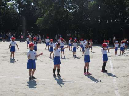 そして「小学一年生ダンス」。「いけ!いけ!ぴっかぴか」の歌に合わせて、ダンスを踊りました。ミニ運動会中もみんなで踊りましたが、それだけで終わってはもったいなので、なかよしタイムでお客さんが見ている中でもう一度披露しました。お客さんというのは、2〜6年生の先輩と先生たちです。