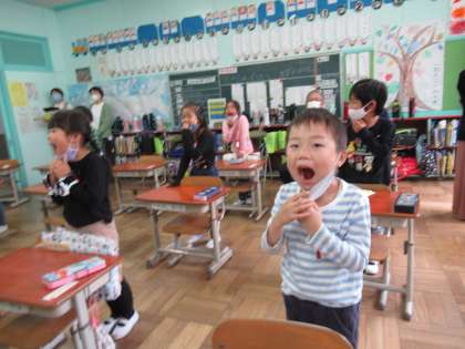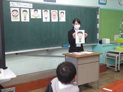 今日は、1年生の2クラスが歯科検診。教育実習生の実習の課題の一つである学級での事前指導を行いました。
