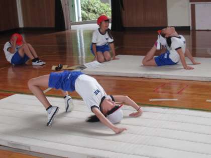 2年生の体育です。マットでさまざまな技の練習をしてきましたが、いよいよ3つの技を組み合わせた発表をするとのこと。発表に向けて、自分の得意な技、みんなに見せたい技を三つどう組み合わせるか、練習しながら考えていました。