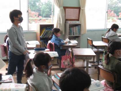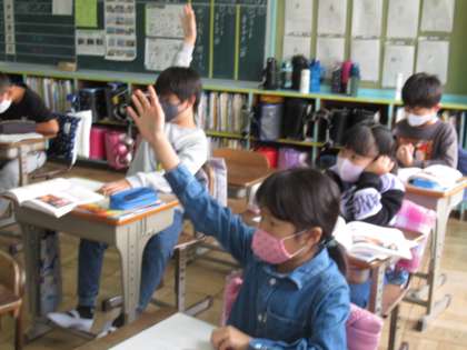 3年生の社会です。3年生用「知多市」の教科書の資料を、みんなで詳しく読み取っていました。知多市の火事の件数と火事の損害額の棒グラフを比較したり、火事の原因を見て気をつけるべきことを考えたりし、気づいたこと、分析したことを発表していました。資料をもとに考えを深める授業。社会科の大事な力を養っています。
