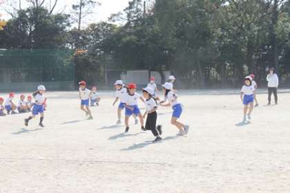運動場で体育の様子です。腰に写真のような「しっぽ」をつけて取り合うゲームをしていました。追いかけたり,逃げたりとかなりの運動量です。ポカポカな陽気で汗をかきながら楽しんでいました。