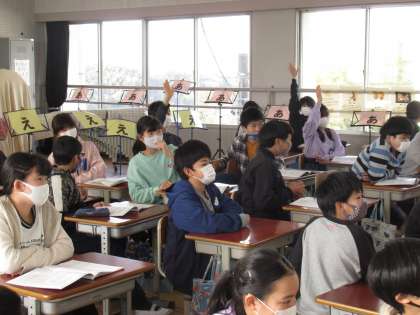 6年生の音楽です。6年生の恒例なのですが「八木節」の演奏をします。今日は、だれがどんな楽器を担当するか話し合っていました。対策を講じながら、できる範囲での演奏をしていきます。