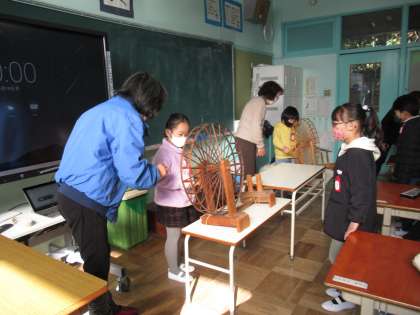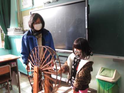 1年生の国語で「たぬきの糸車」の学習をしていますが、今日は地域の方々のサポートのもと、糸車を回す体験をしました。例年ならグループでわいわいとにぎやかに体験するのですが、今年は一人ずつ前に行って順番に体験しました。