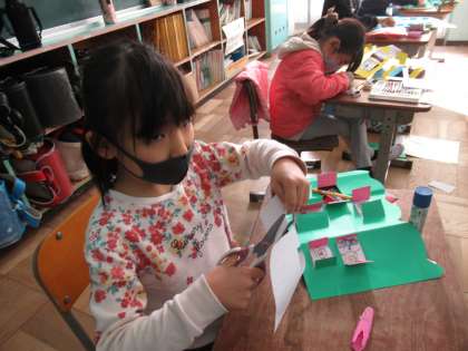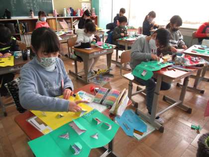 2年生の図工です。「まどをひらいて」という学習に入っています。窓のある作品を作りますが、どんな建物でどんなデザインにするか、窓からどんな人が外を見ているかなどなど、一人一人が工夫して作品を作っています。